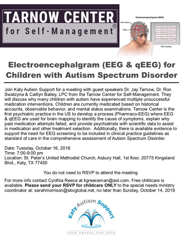 Katy Autism Support and Dr. Tarnow, Dr. Swatzyna, and Caitlin Bailey from the Tarnow Center for Self-Management are joining together to host a meeting on Tuesday October 16.